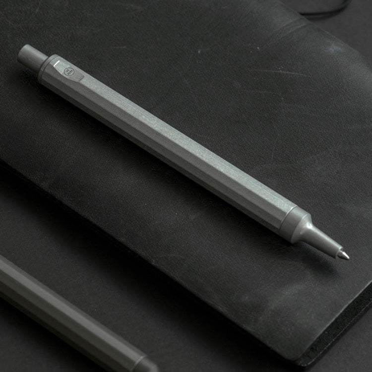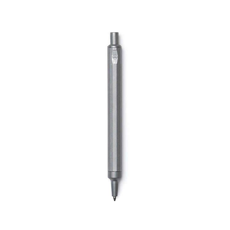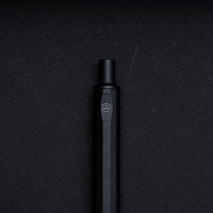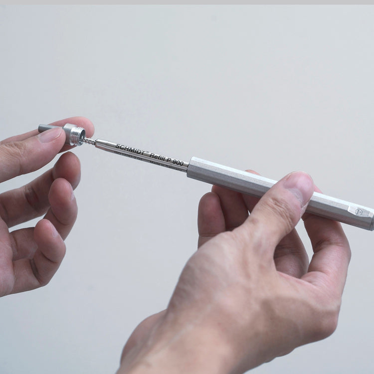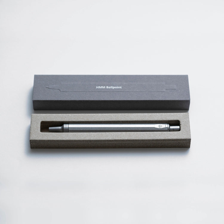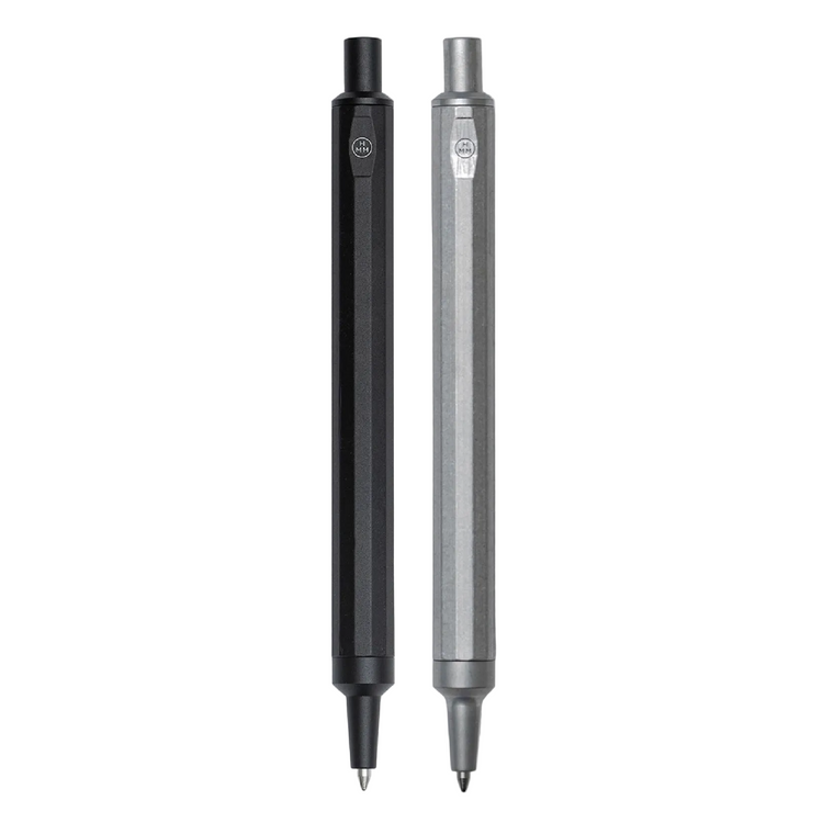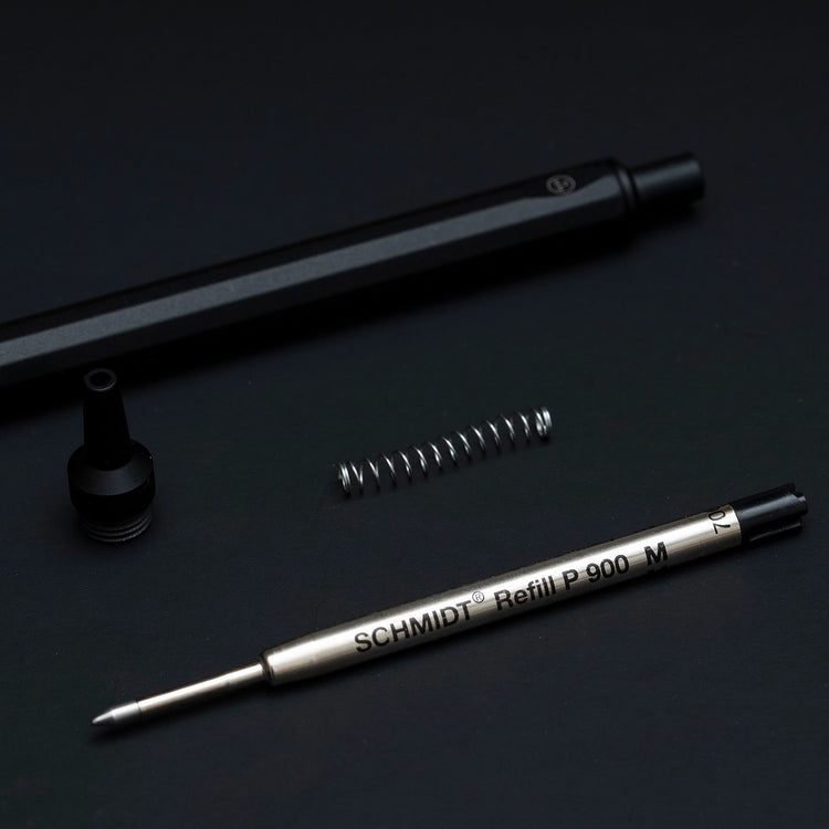 This HMM ballpoint pen is made of aluminum alloy and weighs only 22g, offering light and comfortable maneuvering on paper and making it suitable for extended writing sessions. A heavy-duty spring is used in the click mechanism to provide a sturdy, resolute hand feel. Finely crafted from milled aluminum. Fitted with a Schmidt P900M refill.