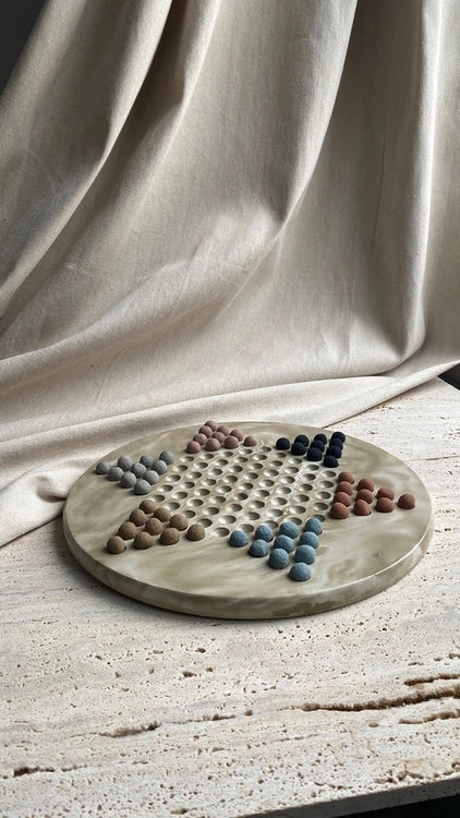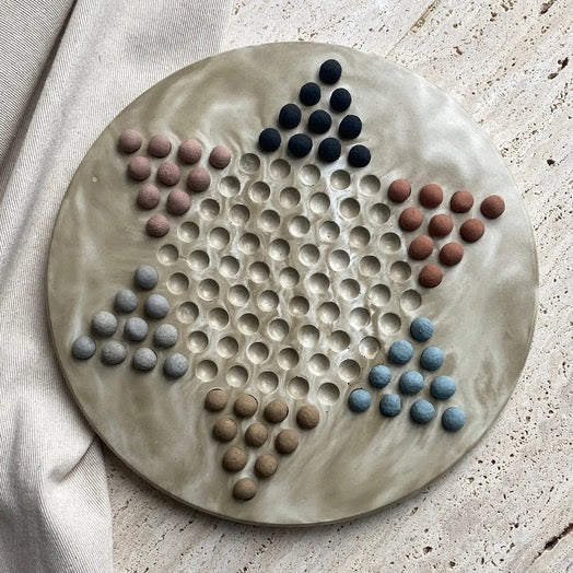 A cement-cast Chinese checkers board that offers a unique take on a classic game. Its slightly abstracted form looks great on a coffee table. Matte, low-key colors.
