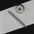 A substantial aluminum pen, always at the ready on your desk with its matching machined base.