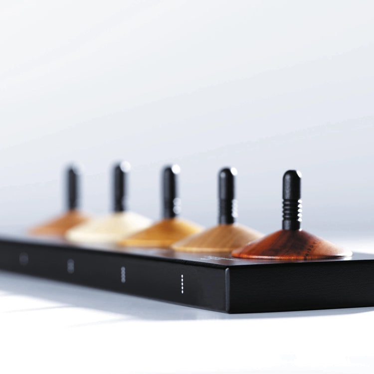 Spinning tops in wood – the pulse of time How fascinating rotating spinning tops are, especially when they are made of 5 different fine woods. Aesthetically aligned on a small black base, the participants await the starting signal. Which top rotates the longest, the one made of maple, pear- or cherry-wood, or maybe walnut? The game of stability, instability, and rotational powers can begin.