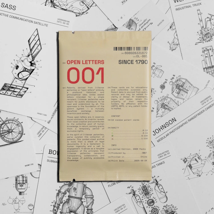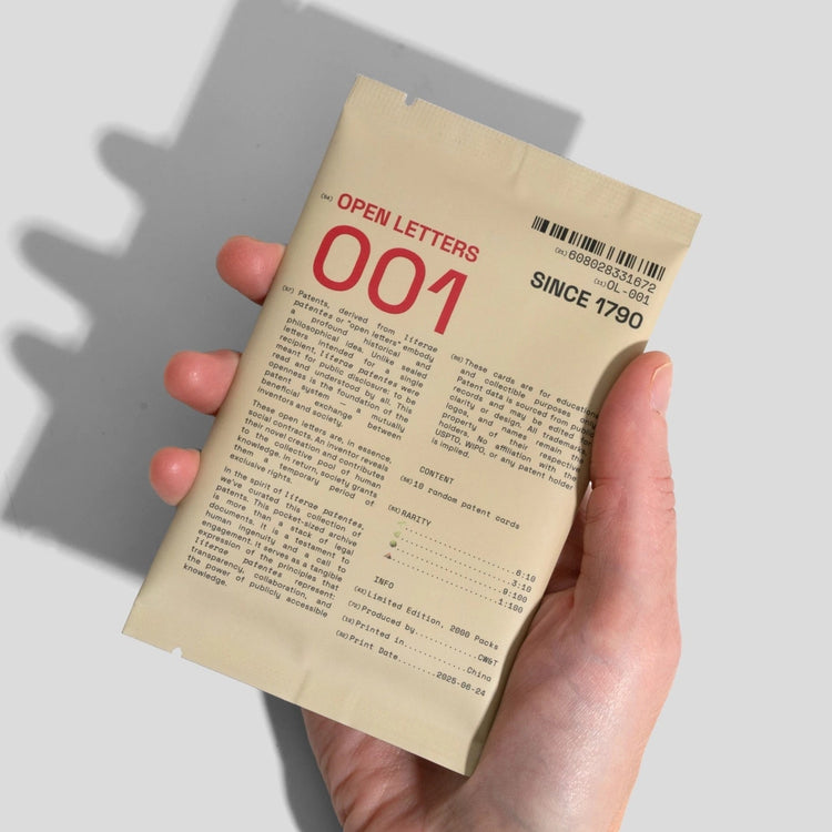 Open Letters is a testament to human ingenuity and also a call to engagement, intended as a tangible expression of transparency, collaboration and the power of publicly accessible knowledge. This project is for education and collectible purposes only. Patent data is sourced from public records and may be edited for clarity or design. All trademarks, logos and names remain the property of their respective holders. No affiliation with the USPTO, WIPO or any patent holder is implied.