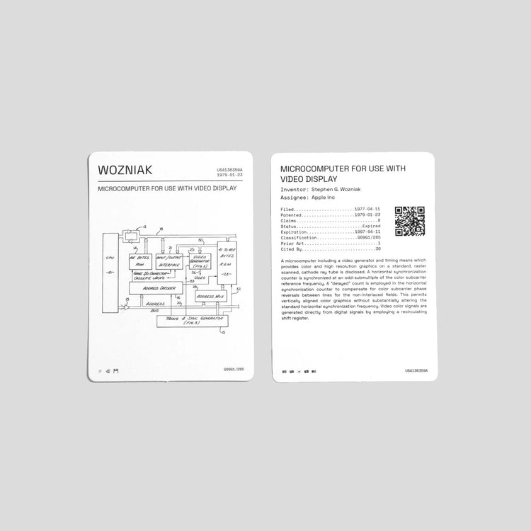 A trading card set of inventions filed with the U.S. Patent office. Each pack contains 10 cards depicting inventions randomly chosen from our curated selection. On the front of the card is an image of the invention, along with the inventor’s name. On the back is more information including filing date, prior art, citations and a short description. The card's rarity is calculated according to a set of parameters and is noted on the card.
